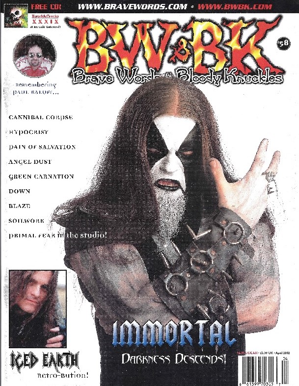 Black metal madness with the charismatic Abbath from IMMORTAL on the April 2002 cover! Check out features with ICED EARTH, CANNIBAL CORPSE, DOWN, SOILWORK, PRIMAL FEAR, and more on metal’s premier magazine.