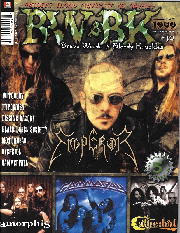 Black metal royalty with EMPEROR on the May 1999 cover! Check out some stories with AMORPHIS, GAMMA RAY, CATHEDRAL, WITCHERY, HYPOCRISY, BLACK LABEL SOCIETY, PISSING RAZORS, and more!