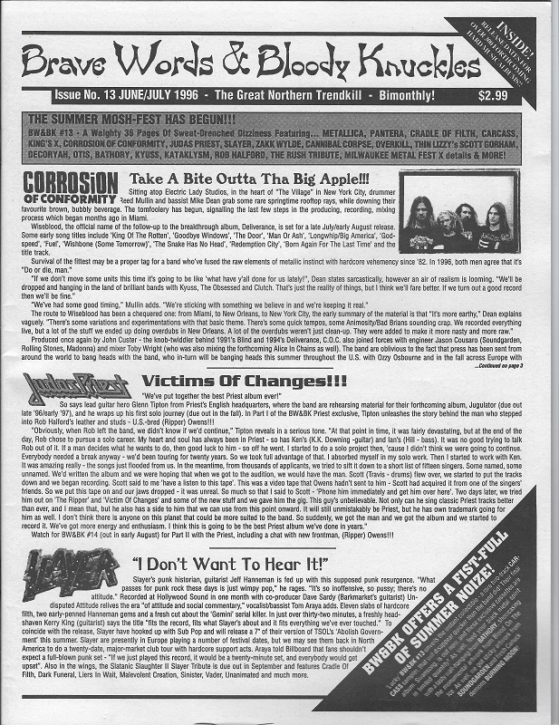 The black and white days of BW&BK continue to bleed the words of metal in the June/July ’96 issue. Check out some features with CORROSION OF CONFORMITY, SLAYER, METALLICA, PANTERA, CRADLE OF FILTH, and JUDAS PRIEST where Glen Tipton proclaims the upcoming Jugulator record as the “best Priest album ever.”