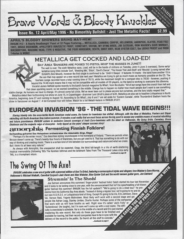 Get information on the “new” METALLICA album Load, up-and-coming Finnish act AMORPHIS, and go inside JOE SATRIANI’s guitar-centered tour idea featuring the likes of STEVE VAI, ERIC JOHNSON, and YNGWIE MALMSTEEN.