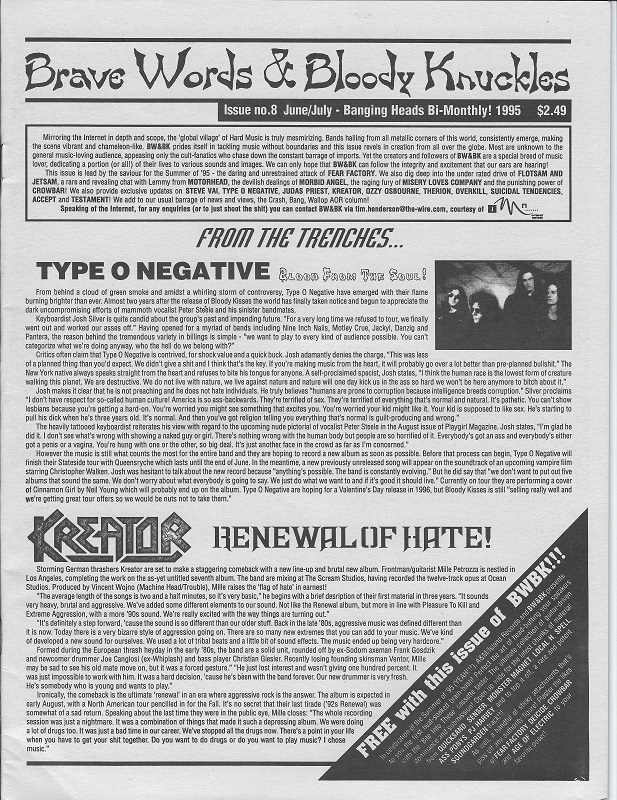 Read about TYPE O NEGATIVE’s genius with keyboardist Josh Silver and denies the band revolves around shock value to make money and KREATOR’s Mille Petrozza delves into the upcoming seventh album (Cause For Conflict) and describes it as “heavy, brutal and aggressive.”